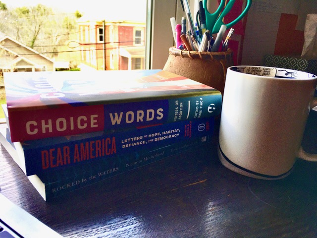 The picture above is from last Saturday’s drive to the nearby Blue Ridge mountains, where we’re trying to take walks most weekends to watch spring’s advance. It’s beautiful out there in a way that seems bizarre and reassuring in turns. The photo below is of three new anthologies I’m fortunate enough to have a poem in–all of them terrific and all of them coming out, as my own books are, at a pretty difficult moment. Here’s a shout out, then, to Choice Words: Writers on Abortion, edited by Annie Finch; Dear America: Letters of Hope, Habit, Defiance, and Democracy, edited by Simmons Buntin, Elizabeth Dodd, and Derek Sheffield; and Rocked by the Waters: Poems of Motherhood, edited by Margaret Hasse and Athena Kildegaard. The Tables of Contents of all three brim with the names of the writers I admire most, and all bring together immensely powerful and moving work. Having work in them is good company. I’m also proud to have an essay on Millay’s abortions, “The Smell of Tansy through the Dark,” in the latest Massachussetts Review. I’ve talked to several editors of print magazines who were rushing to send off spring issues before their university mail services ground to a halt, and I’m so glad this one made it. I wonder how the publishing landscape may change for them and others. One good thing: Ecotone’s most recent issues, a couple of which I have poems in, are temporarily free online. What a gift to the housebound!