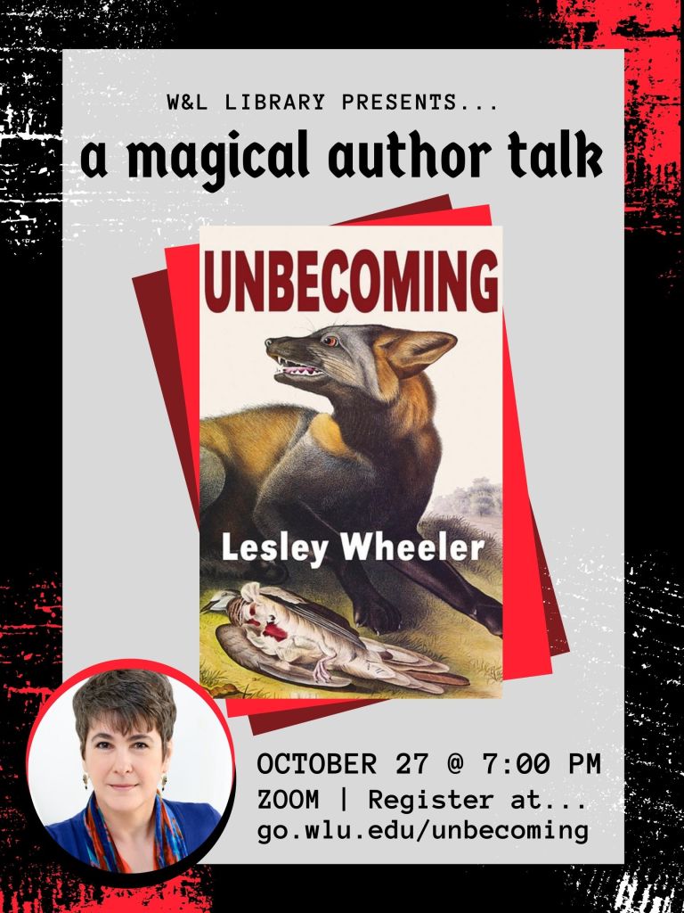 Gifts of late: a wonderful, thoughtful review of Unbecoming in Strange Horizons and a poem called “Dragon Questionnaire” in the same magazine; participating in a warm and intimate reading series organized by Johns Hopkins professor Lucy Bucknell; word of forthcoming reviews of The State She’s In; and a local author talk on Unbecoming scheduled and promoted by W&L’s amazing library staff. The latter is Tuesday October 27th, 7 pm EST, and open to the public–just register here: https://go.wlu.edu/unbecoming. I’ll talk about the book’s origin, read a couple of spooky excerpts, take questions, and give a couple of writing prompts.