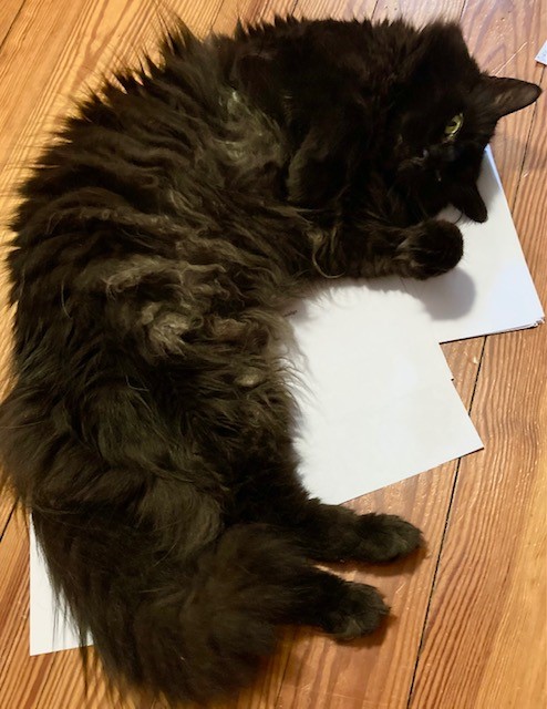 Two other parts of my conference plan worked out in a mixed way, in case it’s of interest. My husband went off to visit family so I could simulate a writing retreat at home. I was able to work hard, but it took a major effort of will to stop spending my nervous animation on cooking and cleaning. I think, if I had the means, I’d try to find another space if I did this again. I did, as I hoped, manage to rough out a draft of a possible next collection; that’s what Poe’s rolling around on above. It’s a mess but a start. Submissions felt impossible, but I’m going to try again tomorrow. Today I’m resting my brain, catching up on chores, and having a back-porch drink with local friends during which I’m very unlikely to think about the po-biz at all.
