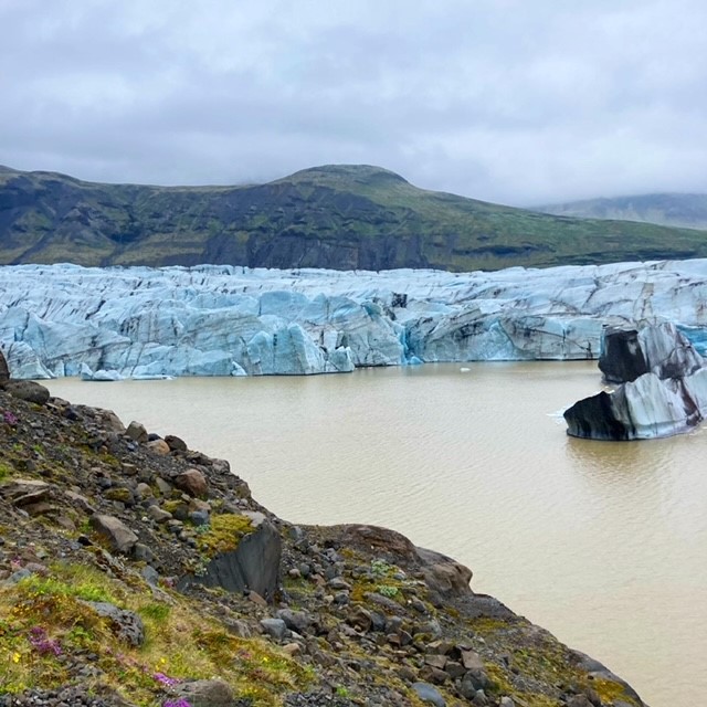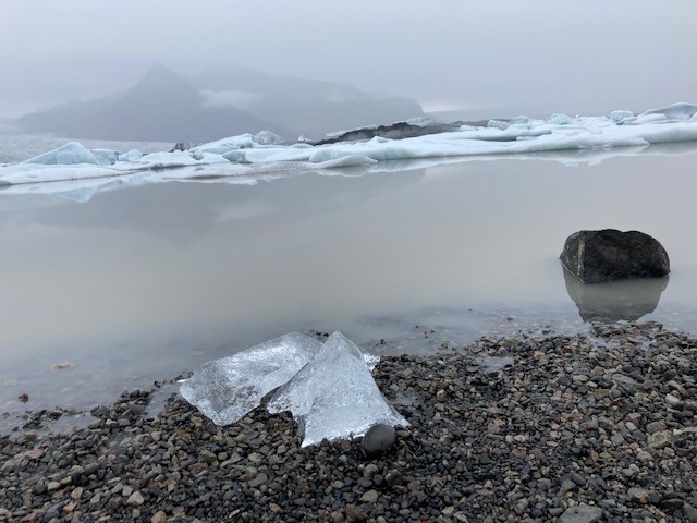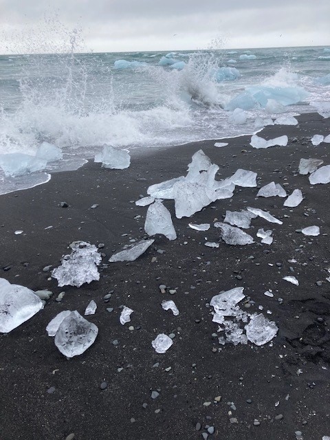 What might stay with me most was the voice of ice on the move. The ocean beach near Jökulsárlón, noisy with sea-sounds and high wind, was so visually amazing we kept laughing with surprise at the black volcanic sands littered with glassy iceberg fragments, and just behind them, larger blue chunks of Vatnajökull bobbing on the waves. (The joy gets a lot more muted when you learn that this arm of the largest glacier between the Arctic and Antarctic is melting so fast that it will be a fjord in a few years.) We heard the ice much more clearly at a couple of less-visited glacial lagoons, Breiðárlón and Fjallsárlón, where we could tramp out to the edge of the lake and listen without other people nearby. The nearest floes were slushy; you could see as well as hear them crack then separate. Larger noises came from further away, including a rumble from the edge of the glacier. We froze to listen, wondering if it was calving.