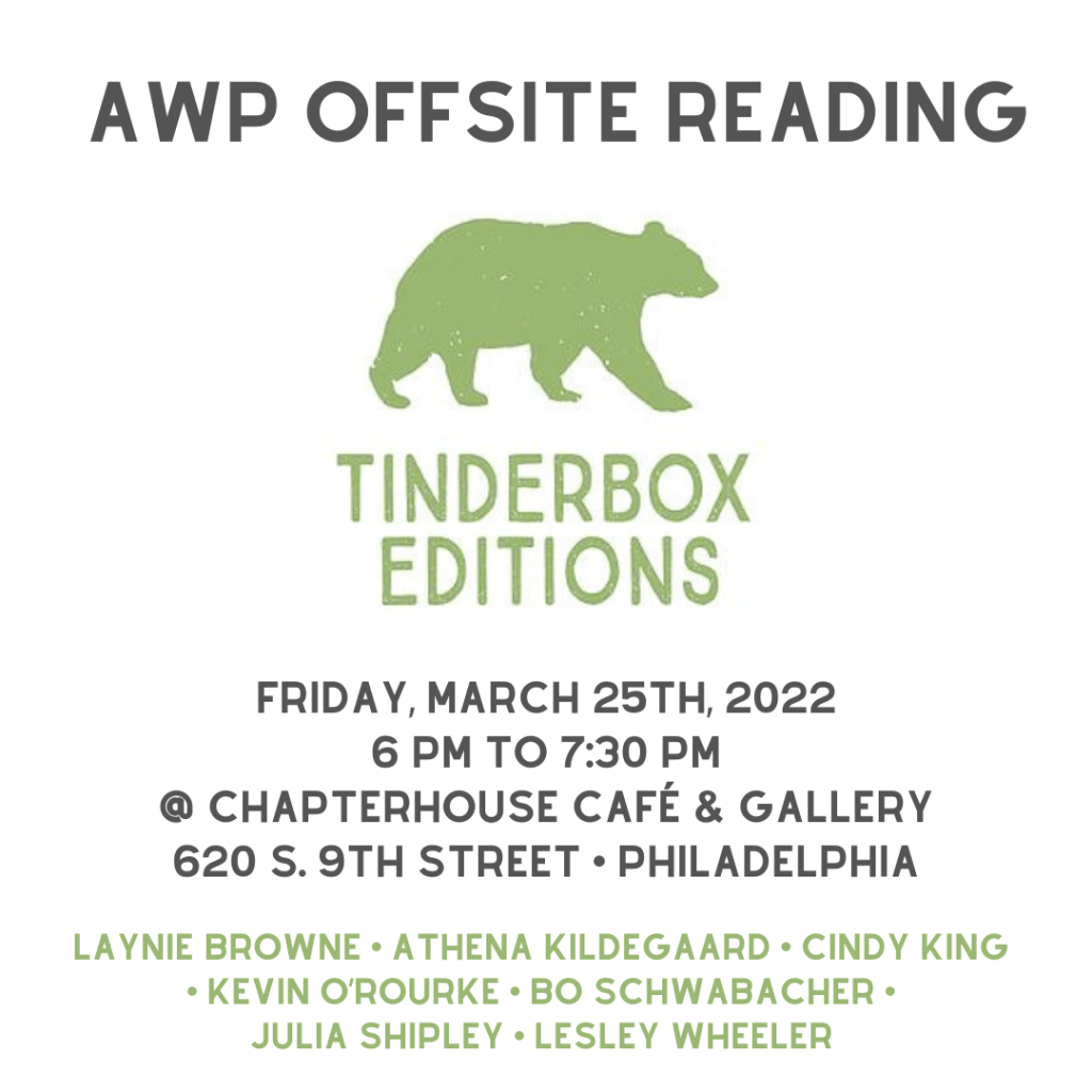 - Friday, March 25, 6-7:30 pm, Tinderbox Editions reading at Chapterhouse Cafe, 620 S. 9th St