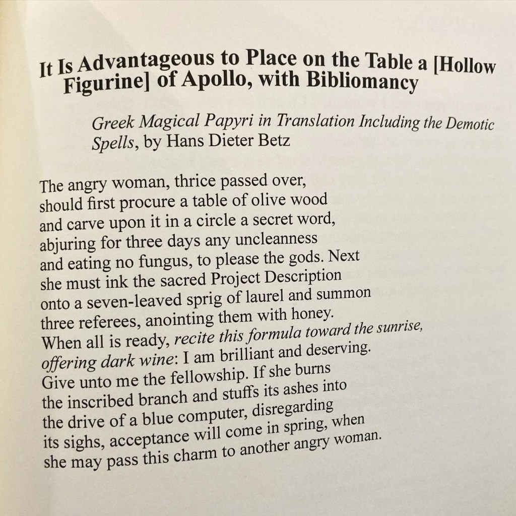 It’s from a series that include lines (italicized) from page 27 of a pretty wide range of books–hence the bibliomancy. Oliver de la Paz was visiting a class of mine years ago and told my students to write a fourteen-line spell-poem with a found line, the color teal (I cheated), and the breath of a machine. Look what he hath wrought…