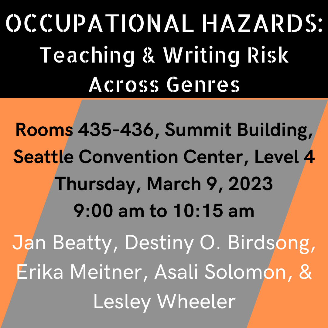 • Thurs 3/6: 9:00-10:15, “Occupational Hazards: Teaching and Writing Risk Across Genres” with Jan Beatty, Destiny O. Birdsong, Erika Meitner, and Asali Solomon, Rooms 435-436, Summit Building, Seattle Convention Center, Level 4
