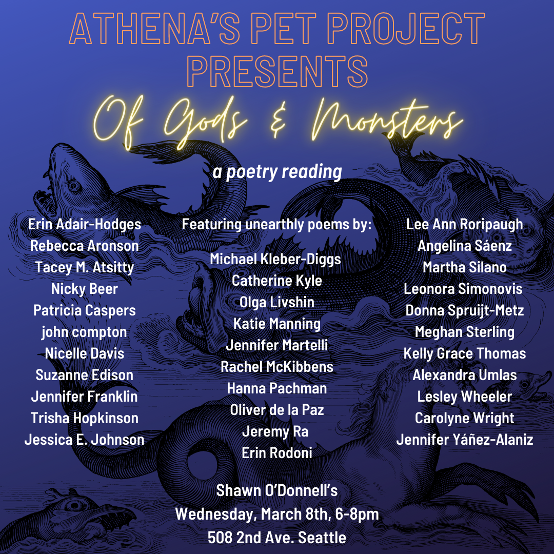 - Weds 3/5: Of Gods & Monsters: A Poetry Reading, 6-8 pm, Shawn O’Donnell’s, 508 2nd Avenue (offsite, and I’m coming straight from the airport and reading toward the end)