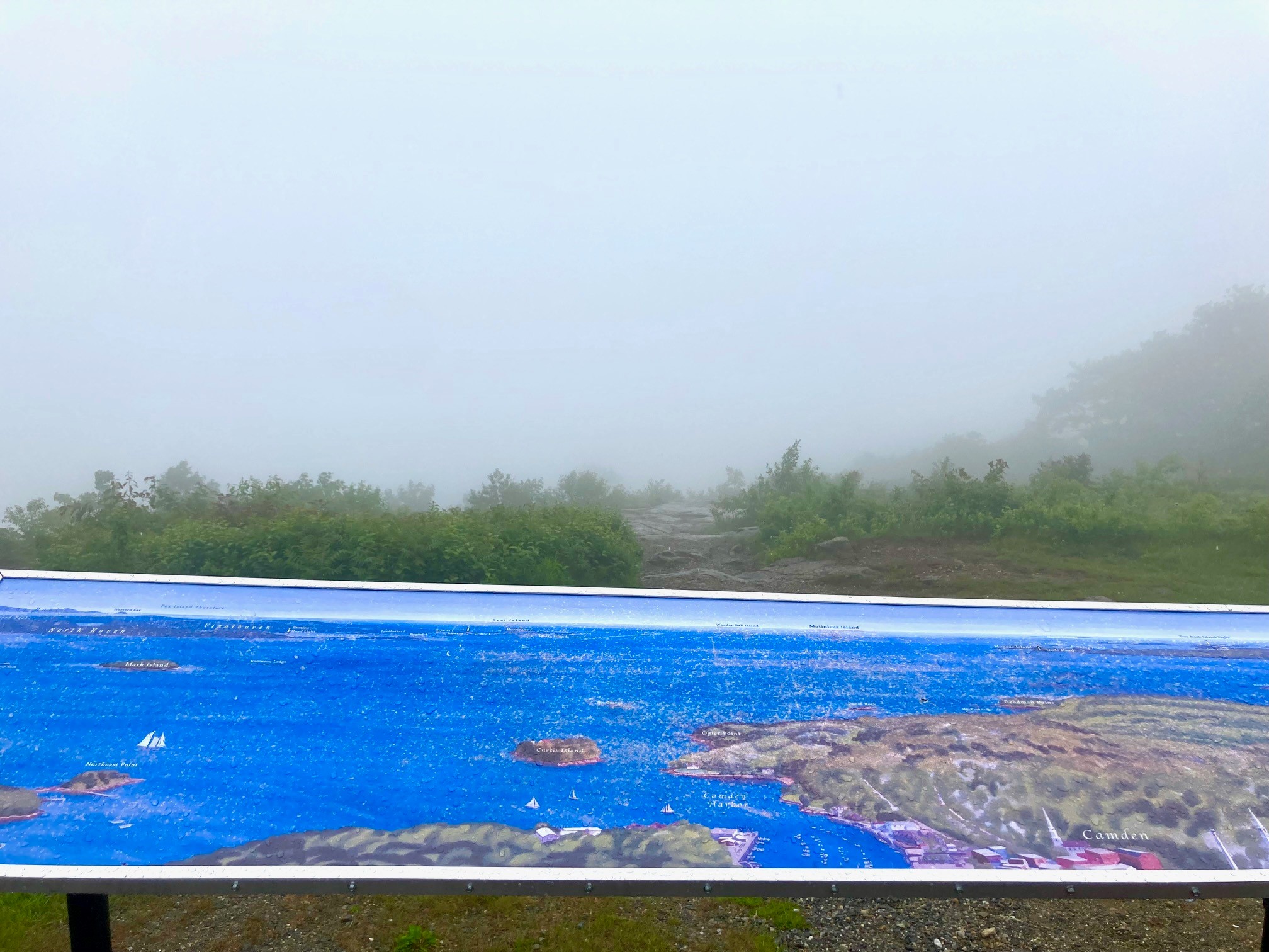 It also struck me as hilarious that when I retraced her steps–by economy car–in the aged half of middle age, with plantar fasciitis and a pulled muscle in my back, after repeatedly shaking my head at ticket-takers who asked if I was eligible for a senior citizen discount, what met me was not “three islands in a bay” but drippy pines and a sea of fog. I could have been anywhere. Ah, the grand view from my fifty-fourth summer on the planet! There’s a poem in there somewhere.
