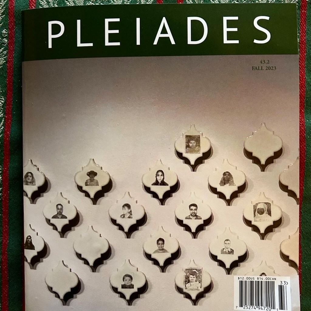 What have I written in 2023 besides committee reports and recommendation letters? A modest sprig of poems; an essay draft; and revisions to my novel Grievous, about which I’ve begun to query agents. Also some framing text and questions for this interview that just appeared in Whale Road Review: “Ominous But Bright: A Conversation with Jeannine Hall Gailey and Cynthia Hogue.” (Read it–they’re so wise and humane.) Of the dozen poems and two essays I published in 2023, the latest just appeared in Pleiades, pictured below. It’s worth noting that “Menopausal Existential Peri-Aubade” was my first appearance in that excellent magazine after sending them 24 poem batches since 2003. Take heart! A poet can get better over time, and maybe, with persistence, lucky!