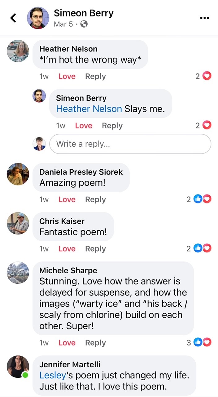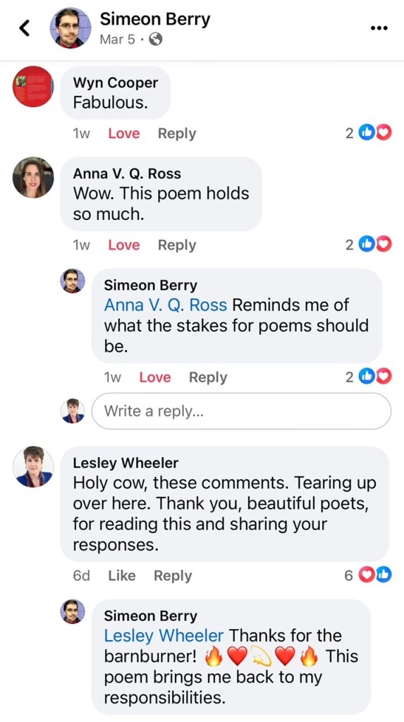 Oh, and at that poetry festival I met Gerry LaFemina, a punk musician and festival organizer as well as distinguished poet. Synchronicities! I’ll close with another small good thing from the last couple of weeks: snippets from an FB thread about a poem that will be in Mycocosmic, “Sex Talk,” initiated by Simeon Berry. I was just stunned by the warmth of the comments. How good to feel like a poet again who maybe has something to say.