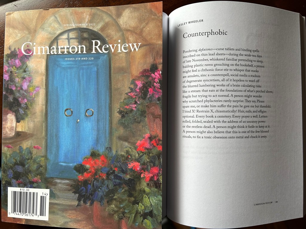 My own po-biz activities: not much in sleepy midsummer, but I’m grateful to have two pieces in a new mag, Hood of Bone Review. Both sprang from a grieving time, “Mother Tree” from the months before my mother’s death and “The Facilities” from a dream-encounter with her after. I also just received a copy of a poem in Cimarron Review, pictured below: “Counterphobic” draws from an intensive period of writing spell-poems, in this case pondering curses etched in metal and thrown into wells to petition a local god’s help, of the kind you see in Bath, England. [Insert spell for better US politics here, tossed into the well of blogdom.]