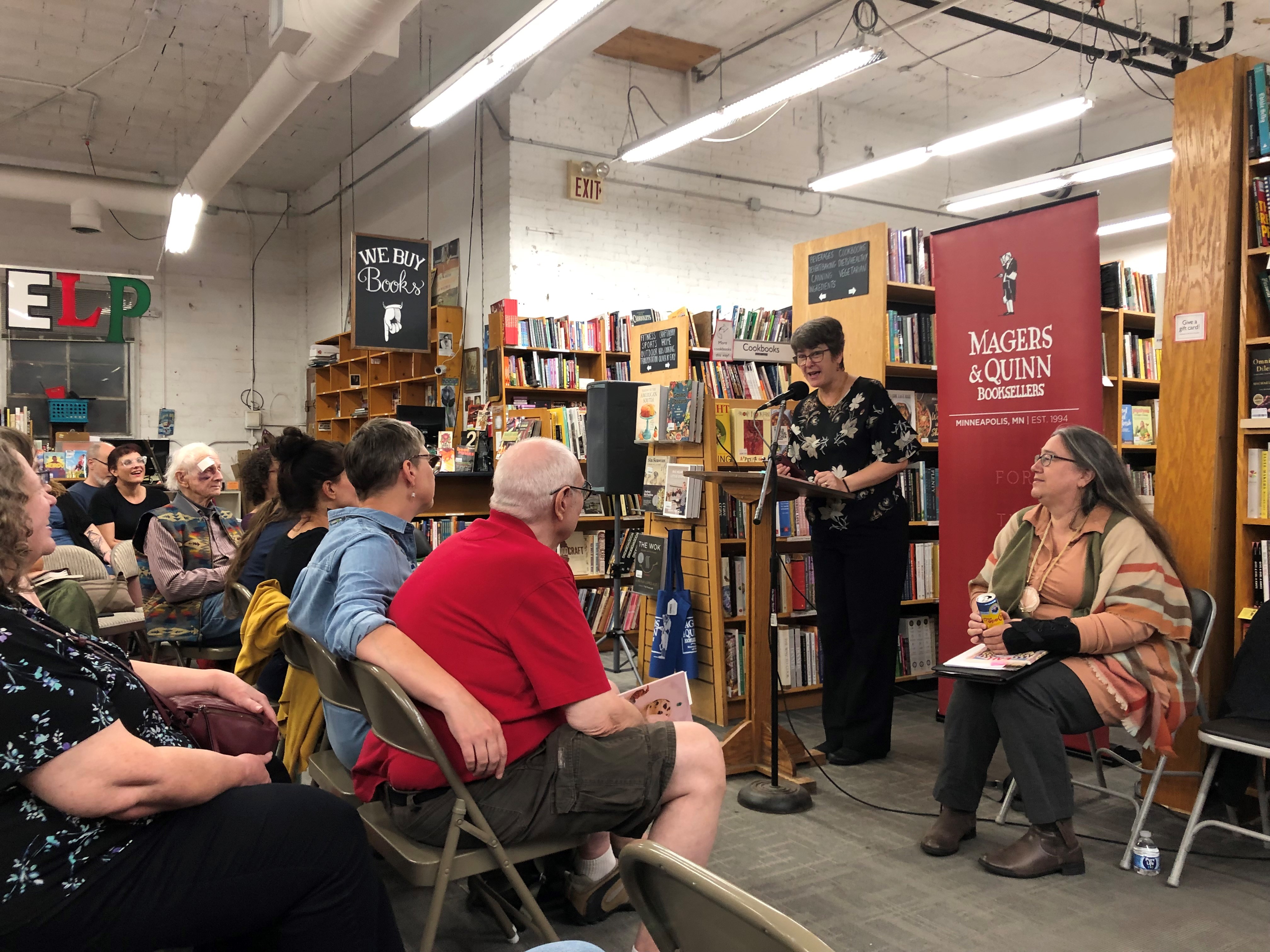 I’ll leave you with a shot my spouse took at Magers & Quinn in Minneapolis on 10/10, when I read with Heid E. Erdrich. Athena Kildegaard, who arranged the whole shindig, got sick. It was a bummer to miss Athena but the energy of the event was wonderful AND it manifested for me a few people I’ve only met virtually, including the wonderful scholarly-musicianly poetry blogger Frank Hudson. What Robert Frost called “barding around” has lovely moments, and this was one of them.