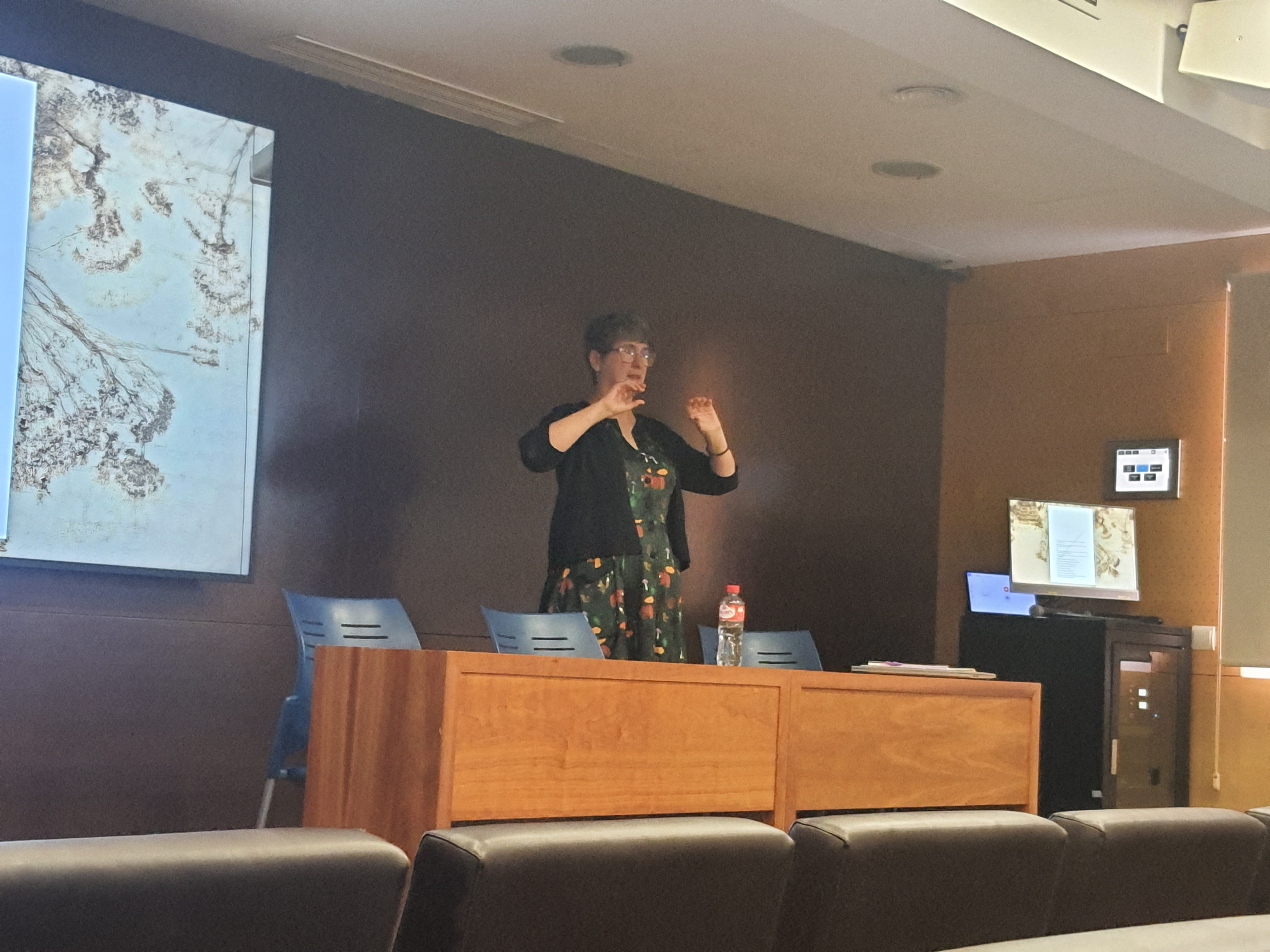 On April 30, though, I felt like I walked into the light again, as the sciatica calmed and the cold faded out. It reminded me of emerging from serious depression, an experience I’ve had the bad and good fortune to undergo several times. Suddenly you look around and think, oh, I’m better, and only then realize how not-there you were for weeks. Madrid scenes that stay with me were relatively free from hurt: talking to an avidly interested and very lovely group of students after giving a conference keynote about fungi and Mycocosmic; a long lunch at an outdoor cafe with Chris involving salmorejo and a fino sherry spritz; then another extended meal in a mountain village with fellow conference-goers, while their kids ran around on the patio, after a tour and tasting at Maltman Brewery. (Hmm, fermented painkillers were definitely part of the magic.) A few snaps are below testifying that I actually have been talking up a storm, even if what I said is now kind of fuzzy.