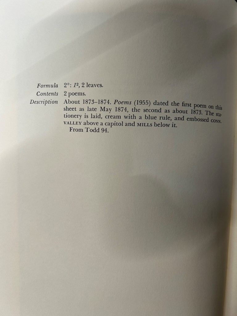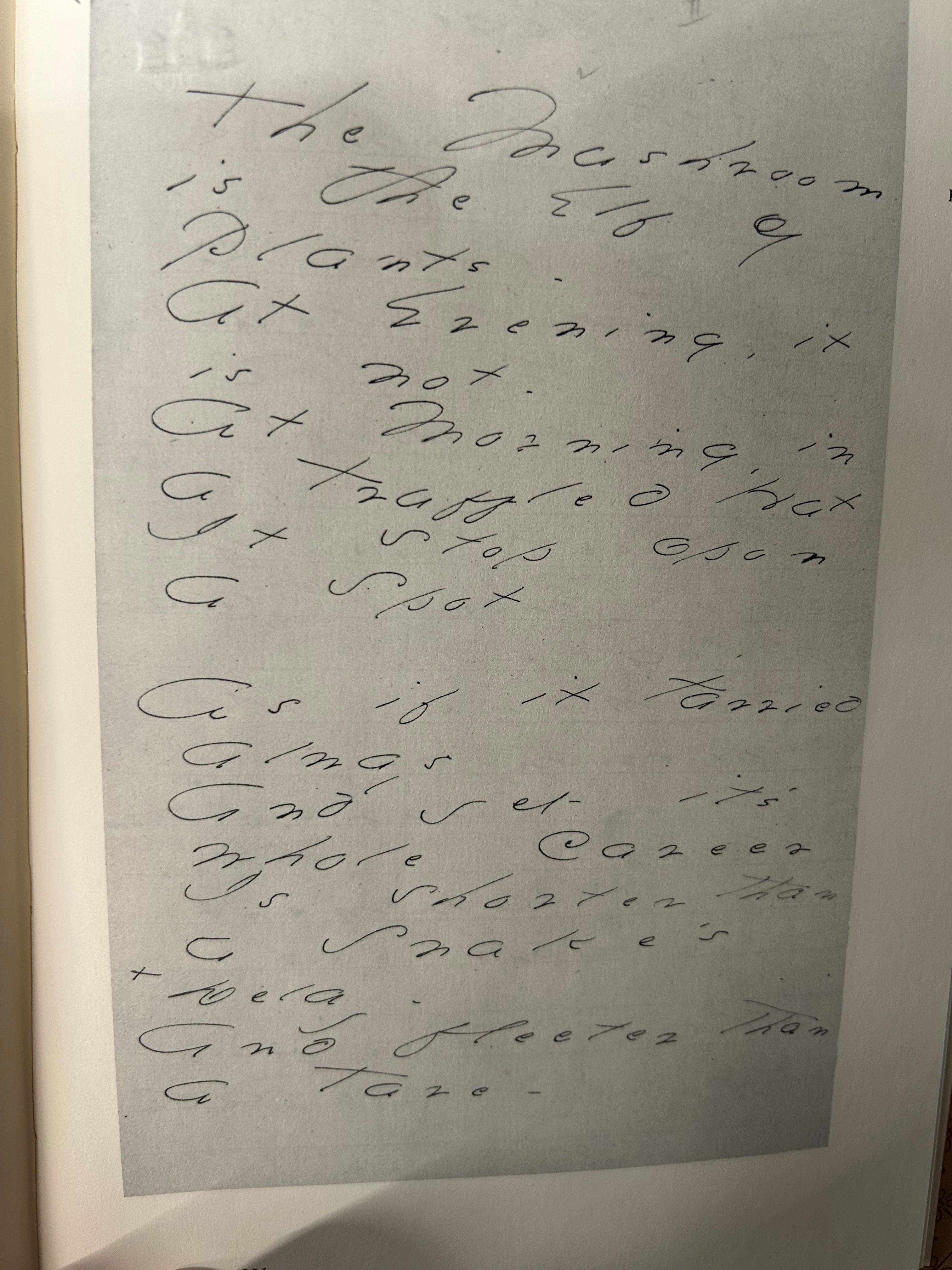 In the meantime, a little more on Dickinson’s “The Mushroom is the Elf of Plants”: I’m now firmly convinced that “Truffled Hut” should read “Truffled Hat.” As Dickinson’s fans know, she hardly ever saw her poems into print and early editors tended to bowdlerize them; in the1950s, editors started revisiting her manuscripts, some of them sewn into little booklets or “fascicles,” to translate them to print more accurately, although her ambiguous handwriting and inclusion of possible alternate wording makes that tricky. A ms version of “The Mushroom is the Elf of Plants” DOES survive, contrary to what the internet had me believe (shocking, I know, that a web search led me astray). Reproduced in Franklin’s The Manuscript Books of Emily Dickinson, it reveals how closely her longhand lowercase a’s resemble her u’s: it’s not a matter of whether the top curve touches the upright, as you’d think, but of how close the two strokes come. All respect and gratitude to her valiant editors, who in this case interpret the millimeter’s difference perfectly plausibly. I just think “hat,” with its allusion to a mushroom’s cap, makes more sense. I floated my apostate interpretation at my Phosphorescence reading last week, a totally lovely event that was superbly run, and earned a nod from the moderator plus a comment in the chat: “Team Hat!” I felt quite pleased with myself.