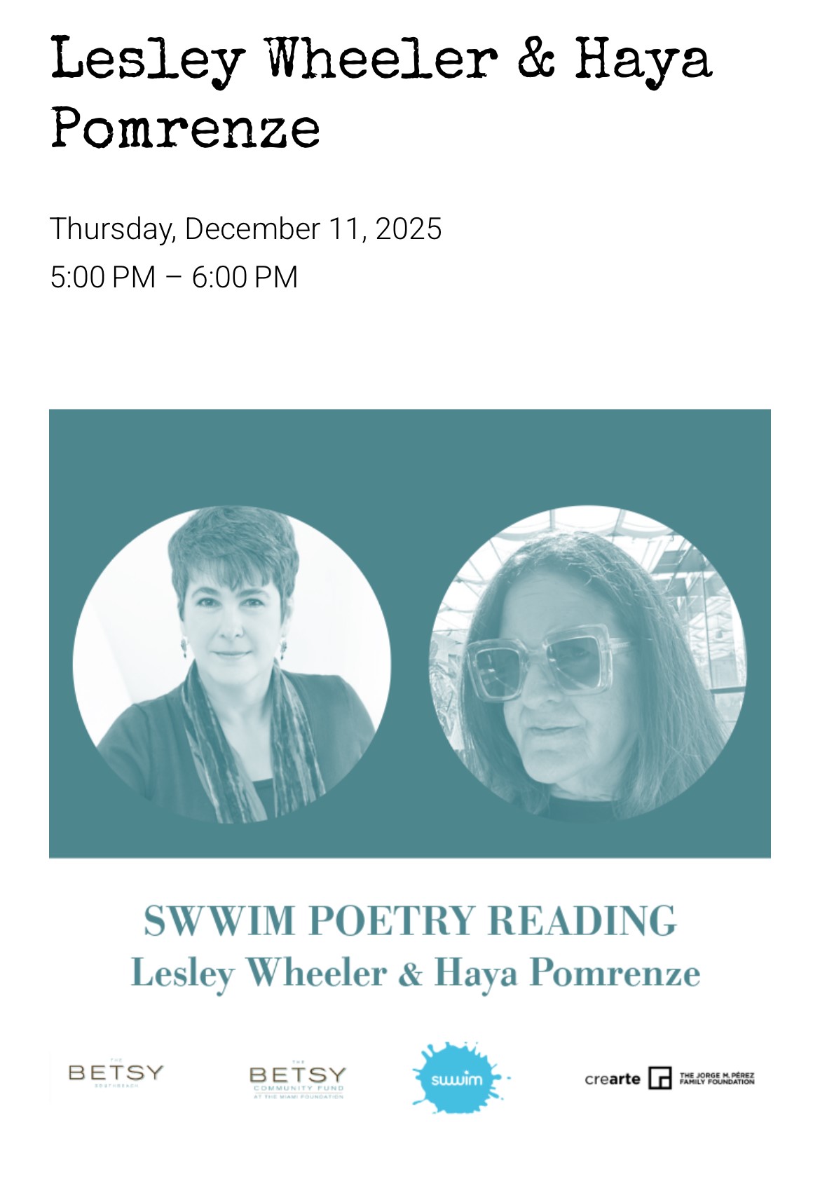 The last row: a peek ahead at late fall/ winter events: more literary luck, however you slice it. If you’re in Miami, you can see more about my SWWIM reading at the Betsy Hotel with Haya Pomrenze on the EventBrite page.