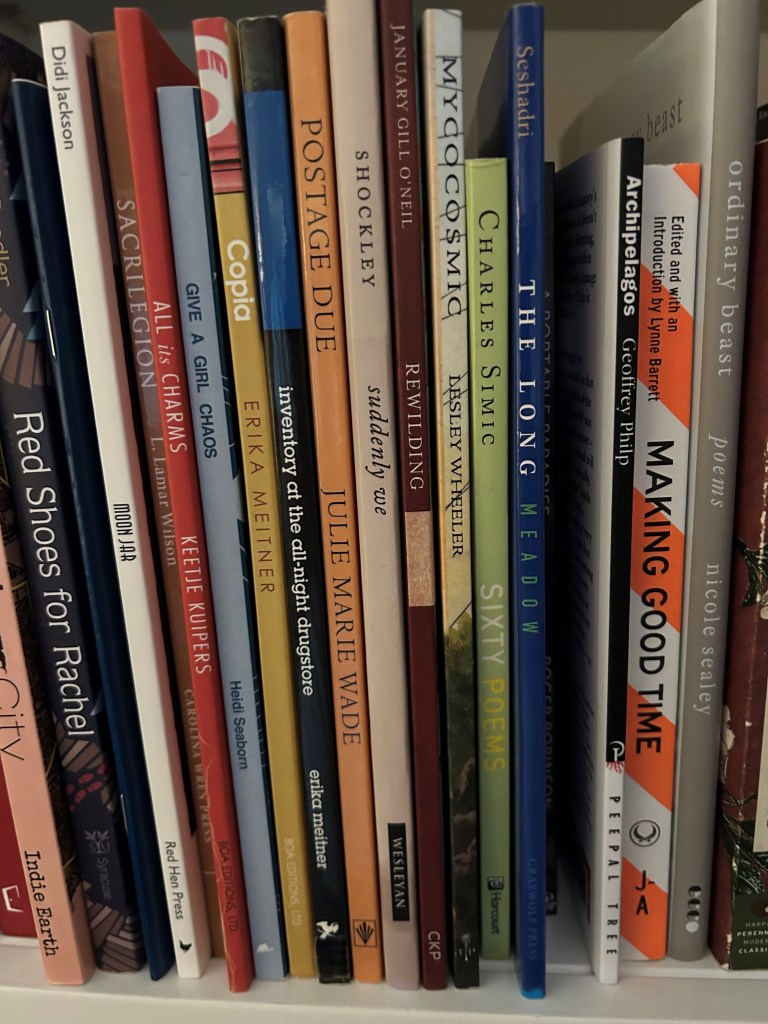I have some ideas about why the snail captured my imagination. My long-ago dissertation on U.S. women poets was called The Poetics of Enclosure, after all. I’m attracted to inward-turning spaces–like the lyric poem–that also, paradoxically, make room for big ideas, aspirations, and feelings. That gorgeous shell offers protection and secrecy while also enabling movement. I’m an introvert who loves to travel and connect in literary ways–core activities of my 2025–but who direly needs intervals to rest and recharge, no talking, please.