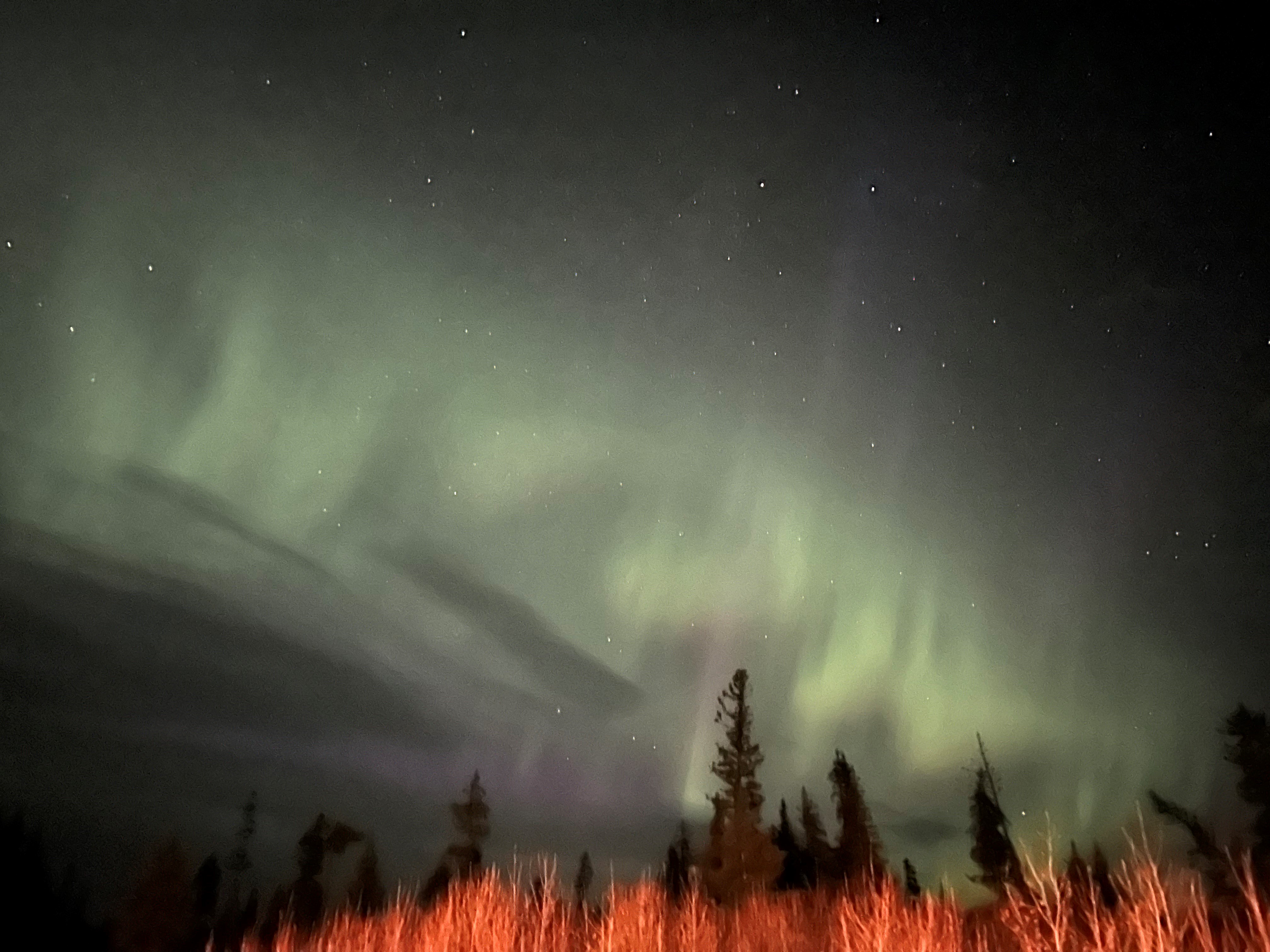 Then, just before 4 a.m., the aurora notification pinged on my phone. I groaned but pulled all the extra layers on and trudged toward the driveway; I knew that’s where other residents had seen the northern lights before. At first I saw a cloudy glow across swaths of the clear, starry sky, but as my eyes adjusted, the glow became greener, full of dancing spikes and pillars. Storyknife sits on a bluff so the sky is very big and very dark. The aurora filled a surprising portion of it. My saw-whet owl kept sounding its alarm from over where a thin crescent moon hung, looking a little wan in comparison. I stood there by myself a while, snapping pictures randomly then putting the phone down to just bask.